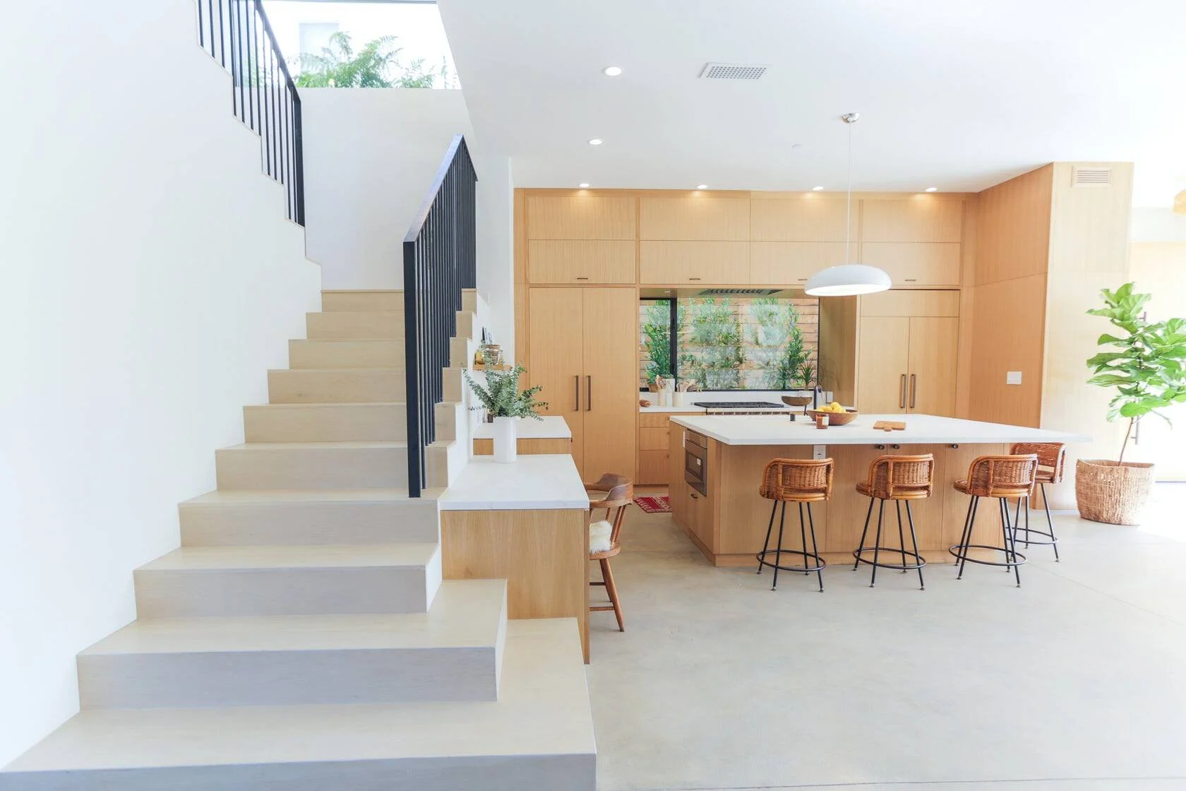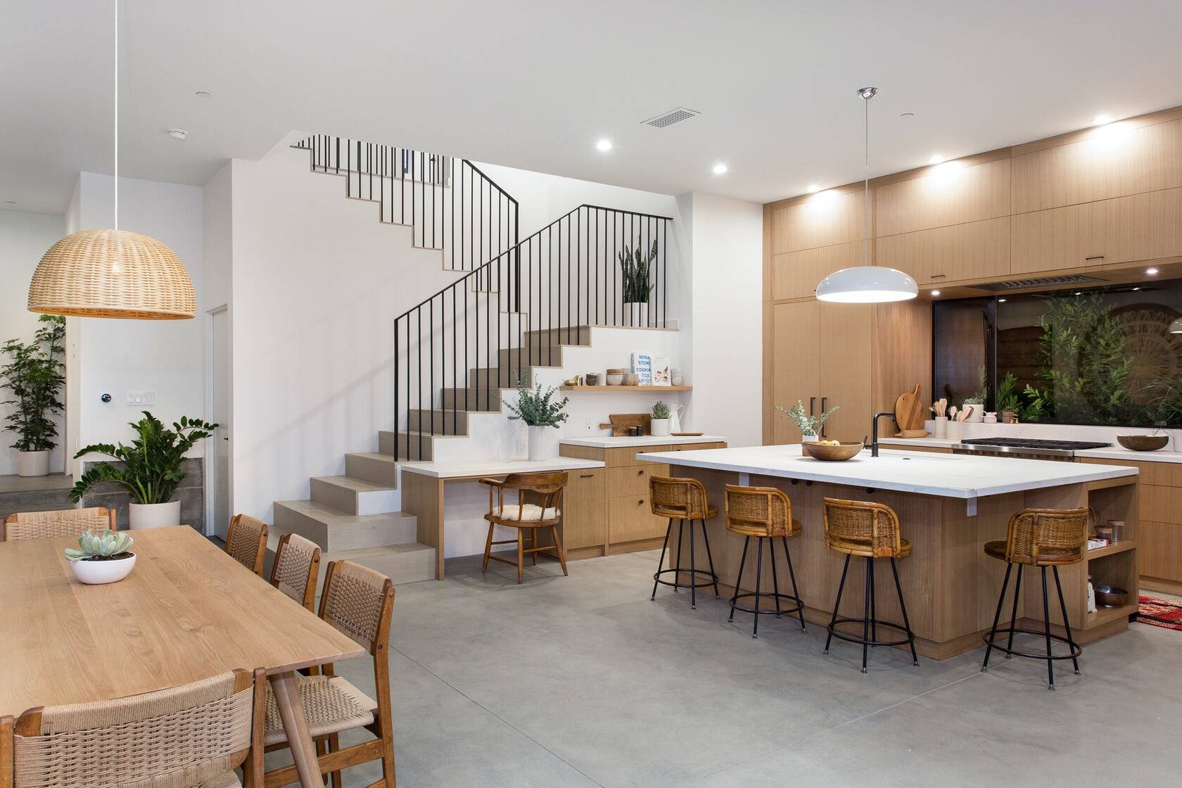 Bếp được thiết kế với tone màu trắng chủ đạo, tạo cảm giác sạch sẽ và dễ dàng vệ sinh. Tủ bếp gỗ ẩn giúp không gian thêm phần gọn gàng và rộng rãi, mang lại vẻ đẹp đơn giản nhưng vẫn đầy đủ tiện nghi. Sàn bê tông xám tro không chỉ dễ dàng làm sạch mà còn phù hợp với phong cách thiết kế tối giản.