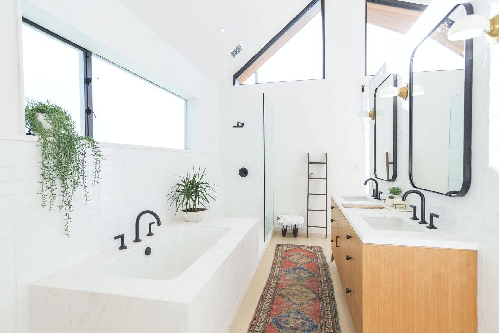 Phòng tắm có thiết kế rất hiện đại, với gạch vân xi măng và kính cường lực tạo cảm giác sạch sẽ và sang trọng. Bồn rửa và vòi sen đều có thiết kế tối giản, không cầu kỳ nhưng vẫn rất tinh tế, phù hợp với phong cách Bắc Âu.