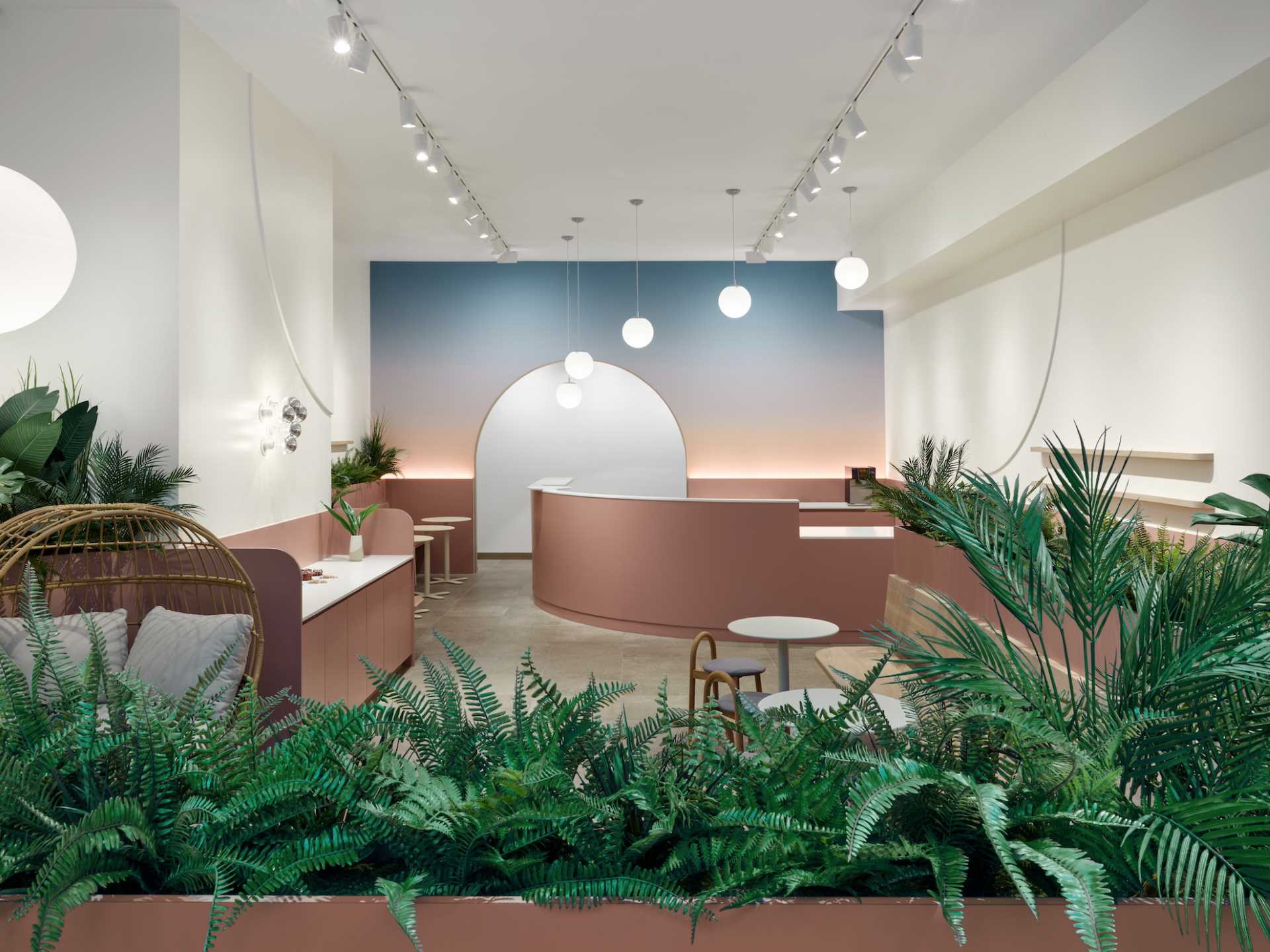 Một trong những điểm nhấn thu hút nhất trong mẫu quán cafe này chính là cách phối màu đầy táo bạo nhưng cực kỳ hài hòa: hồng đất phối cùng xanh lá. Nếu như màu hồng đất mang đến sự ấm áp, nhẹ nhàng thì xanh lá lại tạo cảm giác tươi mát, dễ chịu. Khi kết hợp hai tone này, không gian trở nên vừa lạ mắt vừa thân thiện, dễ chịu – đúng tinh thần “tối giản nhưng không nhạt nhòa”.