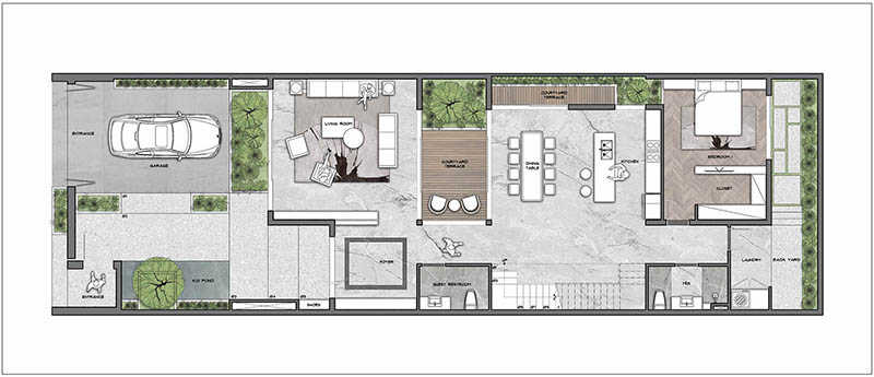 Để gây ấn tượng ngay từ ánh nhìn đầu tiên, kiến trúc sư ưu tiên hình khối đơn giản, mái bằng rộng và các khoảng đua ban‑công lớn. Màu tường trắng kem kết hợp lam gỗ chống nắng giúp giảm bức xạ nhiệt, trong khi tấm lam treo cây leo tạo hiệu ứng “rừng treo” giúp điều hòa không khí tự nhiên. Bể cá koi viền chân tường phản chiếu ánh sáng, đồng thời làm dịu vi khí hậu quanh nhà. Hệ cửa kính trượt sát trần rộng 2,4 m mở ra tầm nhìn vườn xanh, kết nối trong‑ngoài liền mạch yếu tố không thể thiếu cho phong cách nhiệt đới.