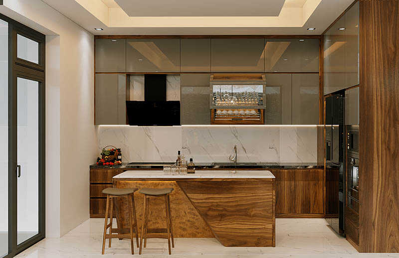 Tủ bếp chữ U dùng gỗ sồi trắng phủ veneer teak vân sọc, tay nắm ẩn, cánh vát 45°. Mặt bàn đá thạch anh 20 mm chống bám bẩn; đảo bếp dài 2,6 m tích hợp bếp từ, bồn rửa, ghế bar chân kim loại. Thiết bị “smart kitchen” (lò nướng steam‑assist, máy hút mùi âm bàn) kết nối Wi‑Fi hỗ trợ điều khiển bằng giọng nói giải pháp tiện ích cho chủ nhà bận rộn.