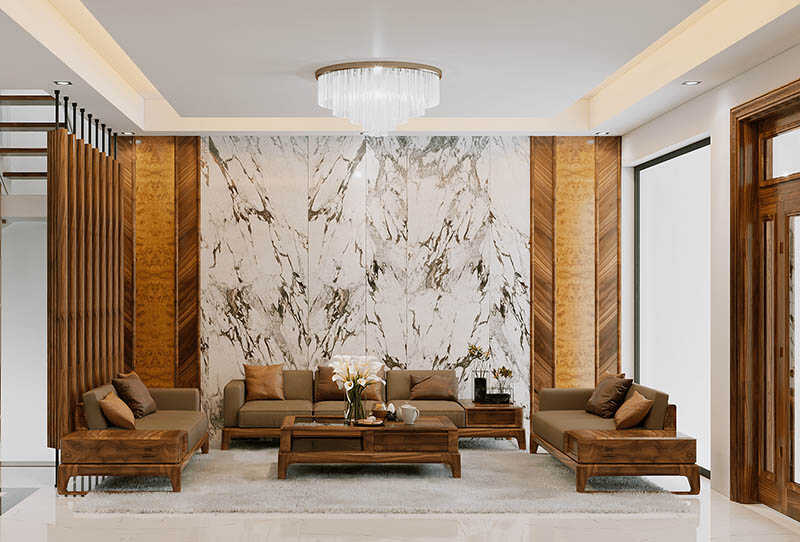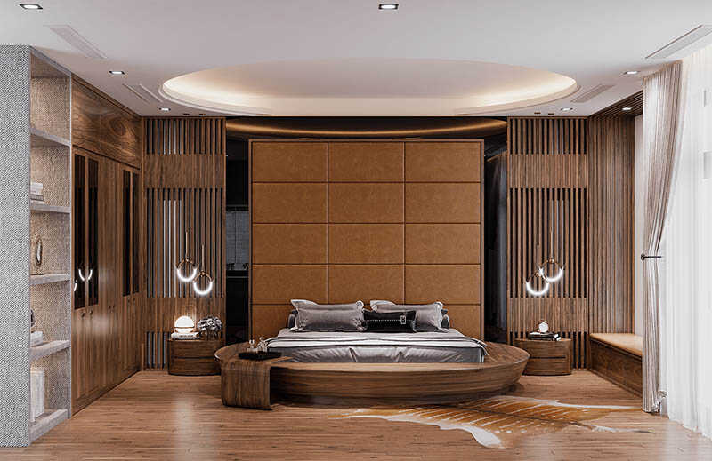 Phòng master rộng 45 m², trần ốp gỗ óc chó chạy sọc, giấu đèn LED hắt 3000 K. Giường king bọc da nubuck, tab đầu giường lửng gỗ ash, tủ áo cánh kính fumé kèm đèn led cảm biến. Điểm nhấn là vách đầu giường ốp đá marble Rainforest Brown loang vân, gợi liên tưởng rừng nhiệt đới. Rèm vải linen hai lớp (voan – cản sáng) cho phép cân chỉnh ánh sáng dễ dàng.