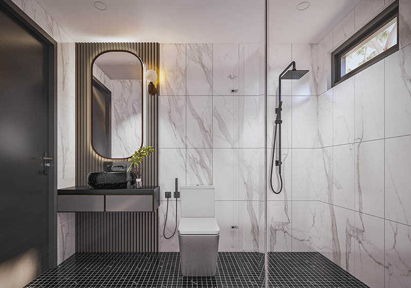 Phòng tắm chủ sử dụng gạch terrazzo xám nhạt 60 x 120 cm lát liền tường sàn, hạn chế mạch vữa. Buồng tắm kính cường lực 10 mm, sen cây âm trần dạng mưa, chậu đá tự nhiên đặt trên countertop gỗ teak chống nước. Gương LED cảm biến chống đọng hơi, hệ tủ treo giấu máy giặt, máy sấy tối ưu diện tích. Cửa sổ cao 1 m mở ra tiểu cảnh trúc, giúp thoáng và có view xanh thư giãn. Nội thất đồng bộ như thế không chỉ nâng tầm thẩm mỹ mà còn khiến tropical house thật sự “thở”, mang hơi nước, ánh sáng và màu xanh vào từng khoảnh khắc sinh hoạt.